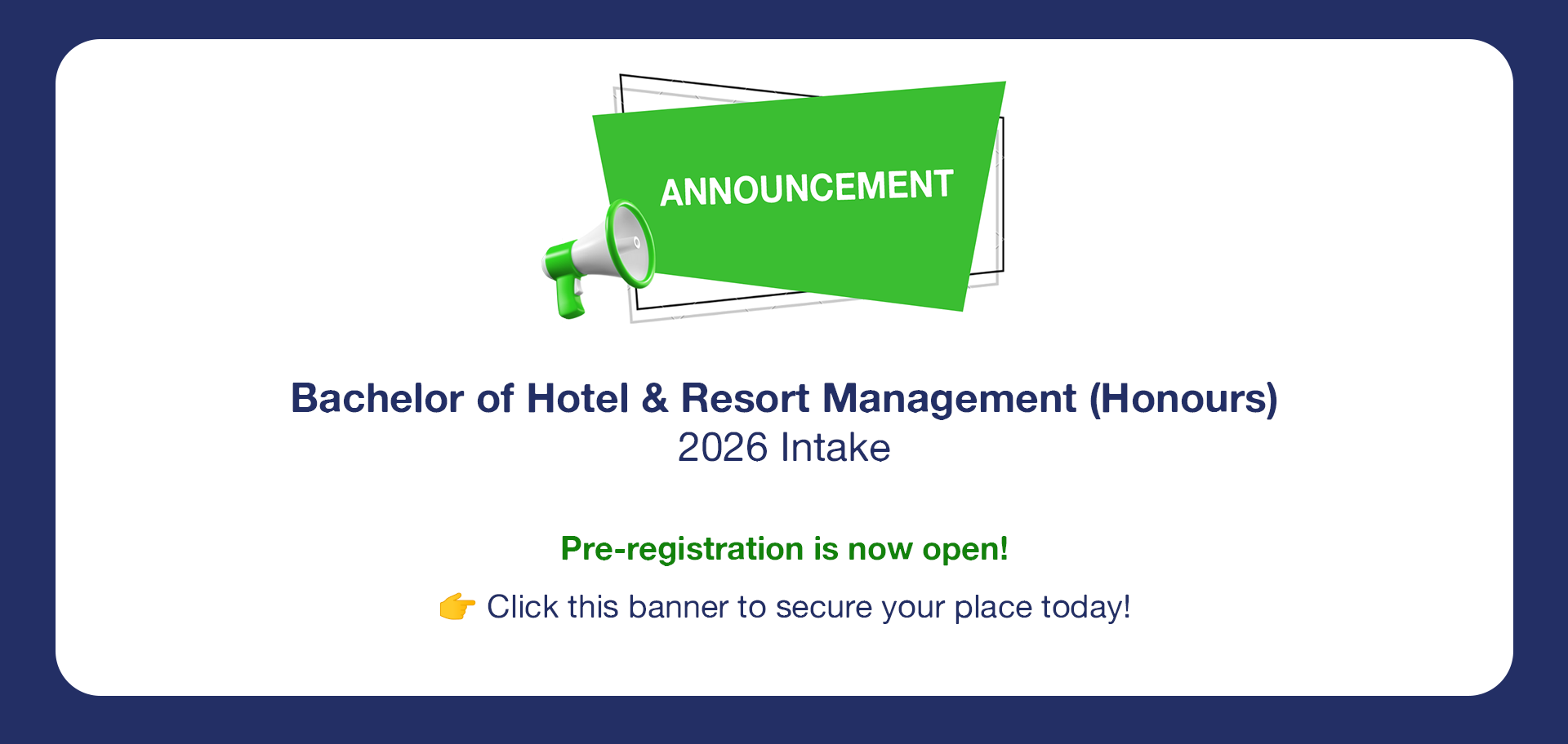 Pre-registration for the Bachelor of Hotel & Resort Management (Honours) is now open!